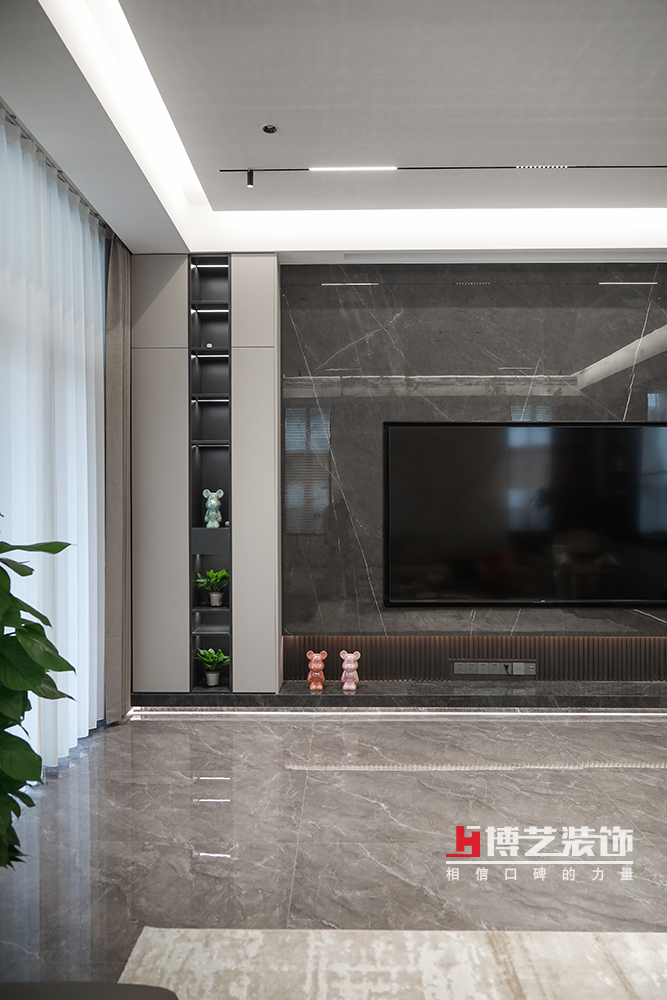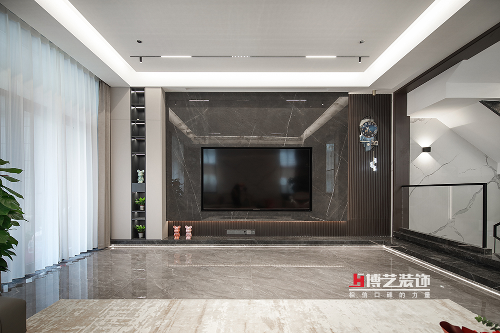 設(shè)計(jì)師以經(jīng)典的黑白灰色調(diào)入手,調(diào)和著現(xiàn)代住宅對于低調(diào)質(zhì)感生活的追求。通過合理運(yùn)用玻璃,石材,格柵,不銹鋼,布藝,皮質(zhì)等不同材質(zhì),融合進(jìn)整個(gè)一樓公區(qū)。無主燈的設(shè)計(jì)搭配下沉式空間,讓整個(gè)客廳區(qū)域彰顯氣質(zhì)。電視機(jī)的黑色大理石背景和沙發(fā)的白色大理石背景遙相呼應(yīng),在黑白之間,打造無限延伸的空間感。