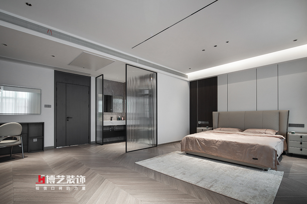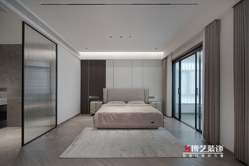 主臥用了一整個(gè)大套房的設(shè)計(jì),休息區(qū),收納區(qū),洗漱區(qū),晾曬區(qū),小憩區(qū),安排得井井有條。整個(gè)色系布置都靜謐寧靜,用白色為主基調(diào),摻進(jìn)細(xì)膩的奶咖色,平添了層次感,讓空間一下柔了起來。