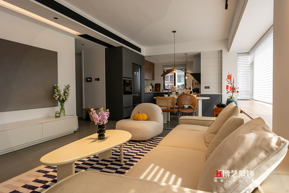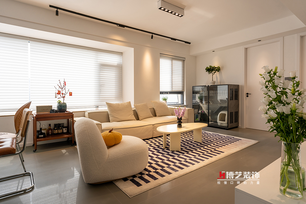 整個客廳采用原始頂,選用適用的軌道燈和點綴燈,做出了無主燈的效果。豆腐干式的三人位沙發(fā)憨態(tài)可掬,白色單人位圓潤可愛,搭配橘色南瓜抱枕,趣味十足。在灰白色的素雅空間里展現(xiàn)松弛與舒適。