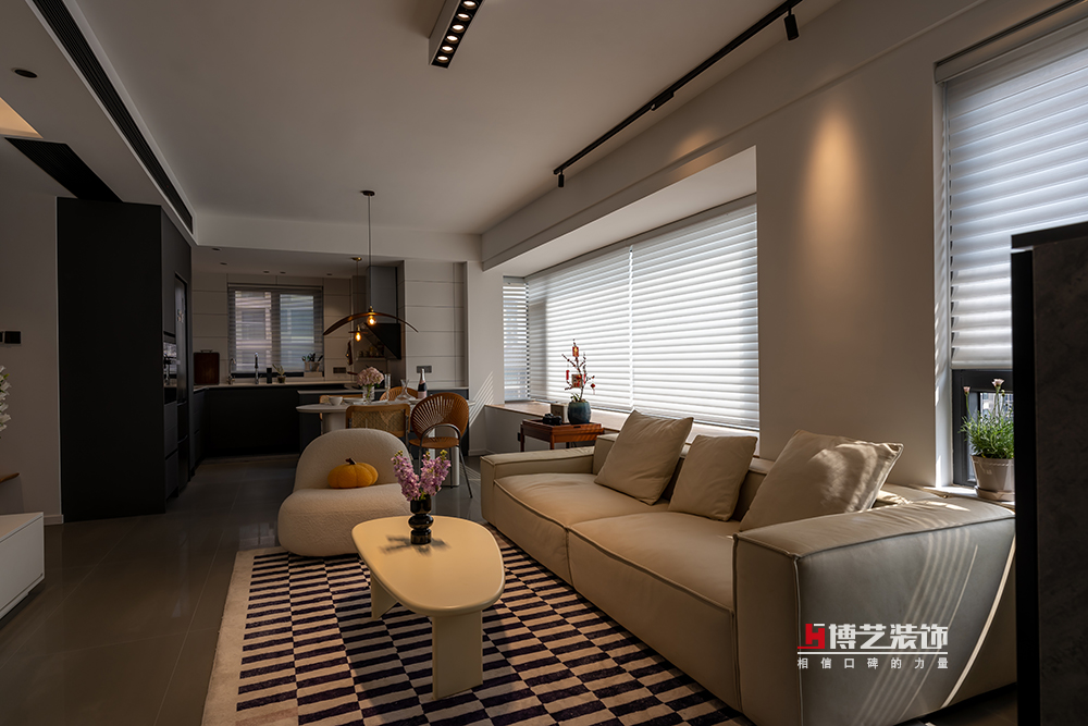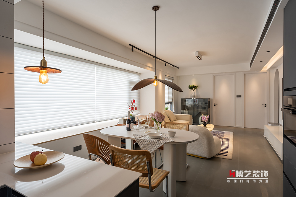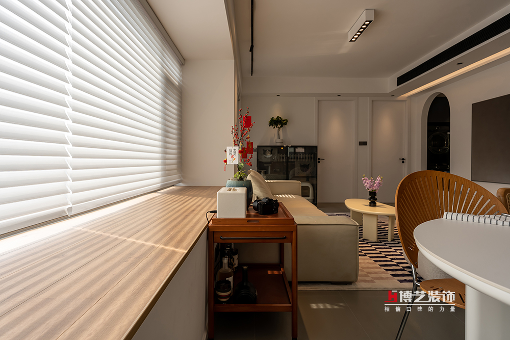 用一個小小的邊幾作為客廳和餐廳之間的過度,放上好酒好茶,共品音樂詩畫。落地飄窗搭配百葉簾,讓整個客廳蒙上了陽光的濾鏡。