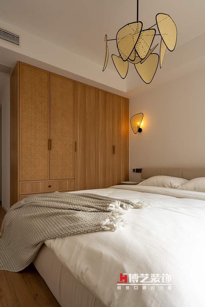 編織的燈罩和家具總給人一種東南亞的異域風(fēng)情。打掉了原來的飄窗和空調(diào)機位,主臥戶型就變得非常的規(guī)整。靠近窗戶一側(cè)用梳妝臺代替床頭柜,兼顧功能和美觀。