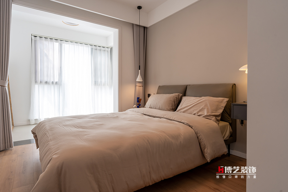 打通了次臥和陽臺,次臥采光就變得很好。同色系的床背景和柜子讓整個空間看著更加整體。用地磚和地板做空間之間的隔離,拉上窗簾就是兩個不同的空間。