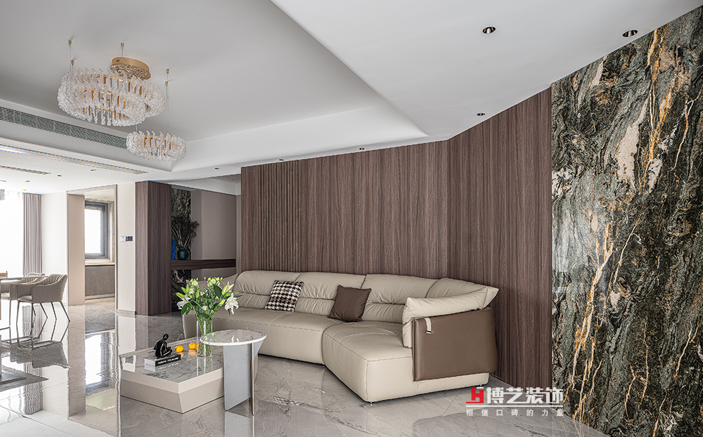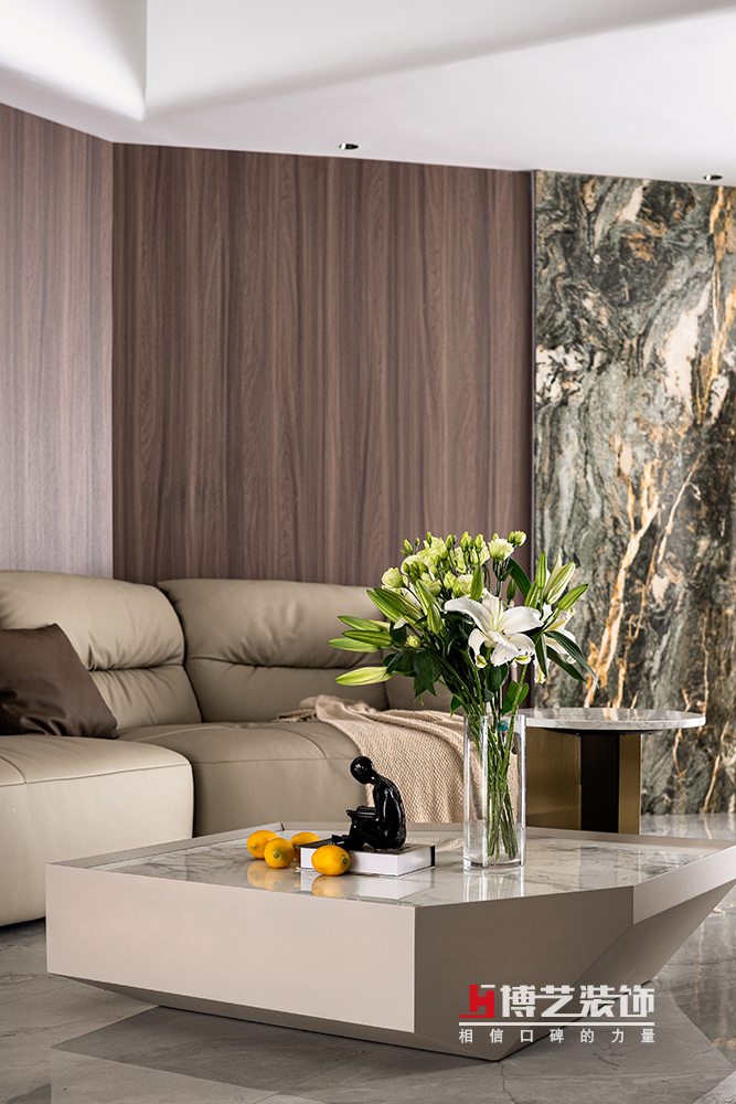 客廳自帶廣角視野,當(dāng)陽(yáng)臺(tái)的光直接進(jìn)入,整個(gè)場(chǎng)域變得寬敞又通透。線條與木作契合,搭配著石材一起勾勒出優(yōu)雅的輪廓,營(yíng)造寧?kù)o而舒適的生活氛圍。