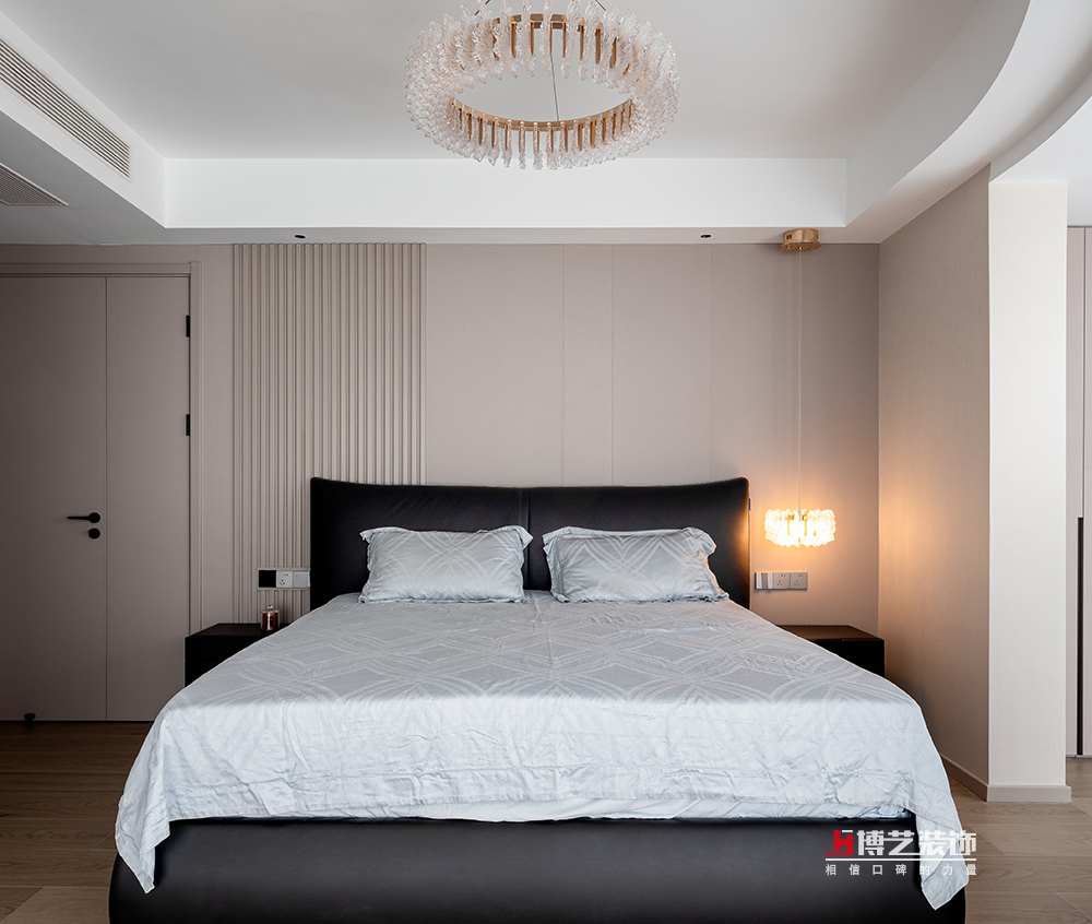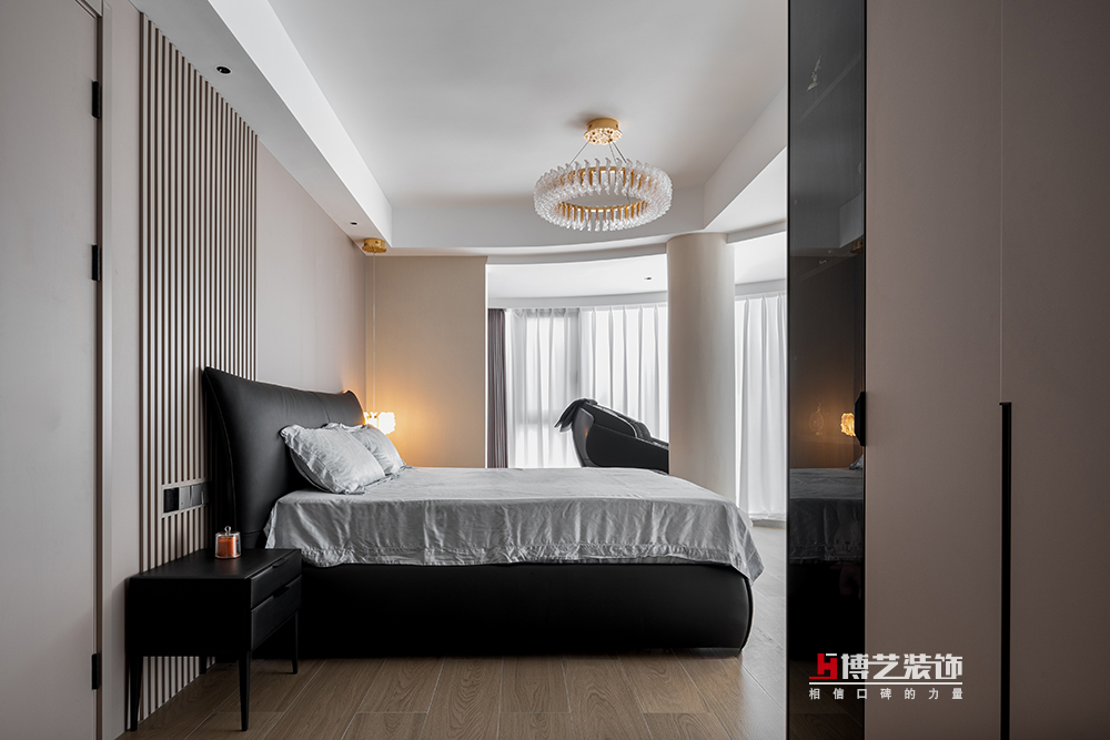 淺奶咖的墻面,溫柔、恬靜,黑色的大床深邃、沉穩(wěn),強(qiáng)烈的對(duì)比,和諧的共處,共同營(yíng)造一片舒適、安寧的睡眠環(huán)境。