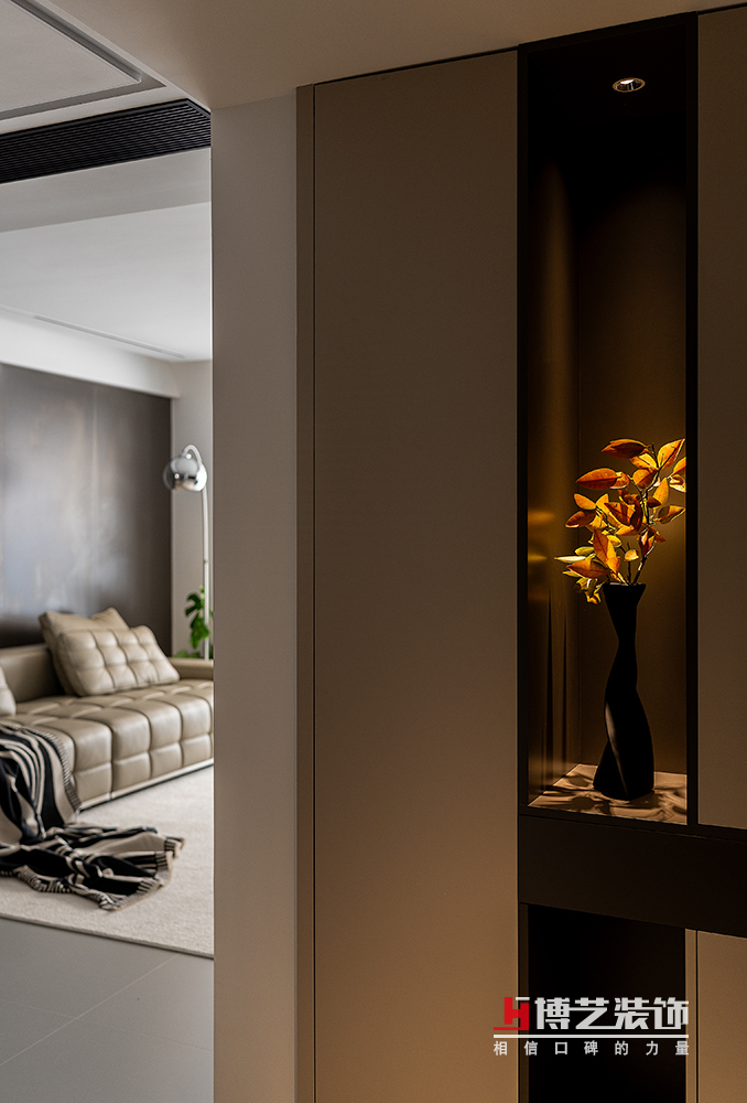 當(dāng)踏入這處居所,映入眼簾的便是玄關(guān)處那高至頂?shù)男P(guān)柜,黑色深灰相輔相成,不僅充當(dāng)著日常的門面擔(dān)當(dāng),也收納著日常的鞋履雜物,更在進(jìn)門的瞬間便奠定了空間的沉穩(wěn)基調(diào)。柜體上方留置了小燈,打在精心挑選的擺件上,為歸家之人帶來一抹溫馨的光亮。