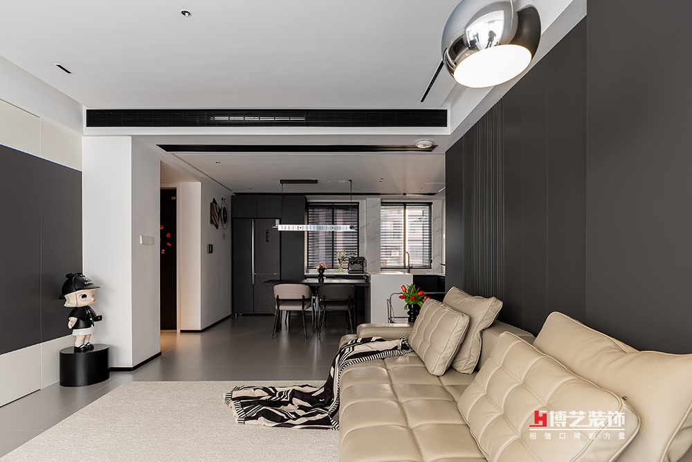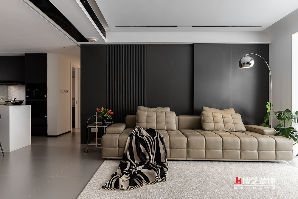 客廳以黑白灰為主色調(diào),地面鋪設(shè)著細(xì)膩的灰色巖板磚,向四周無限延展。墻面則被粉刷成純凈的白色,與地面形成鮮明對(duì)比,讓空間在視覺上更顯開闊通透。而沙發(fā)背景墻和電視背景墻都是黑色的格柵搭配木飾面,互相呼應(yīng)。