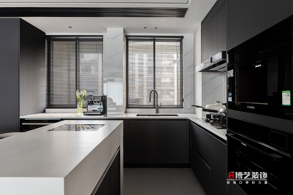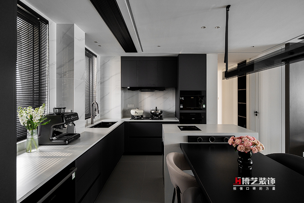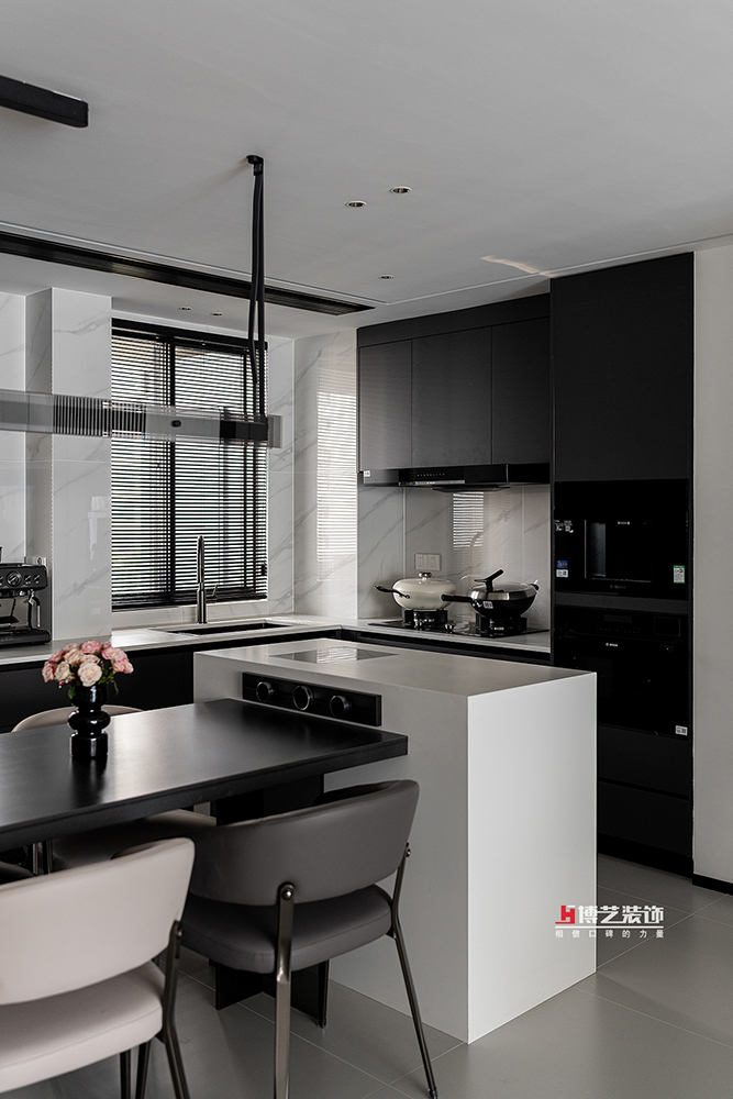 島臺(tái)是整個(gè)餐廚空間的靈魂所在,它不僅是烹飪操作的延伸,更是家人交流互動(dòng)的中心。島臺(tái)采用大面積的白色大理石臺(tái)面,與中西廚的黑色臺(tái)面形成鮮明對(duì)比,成為視覺的焦點(diǎn)。無論是忙碌的清晨,還是悠閑的午后,家人都可以在這里小憩片刻,享受一杯咖啡或一份精致的甜點(diǎn)。