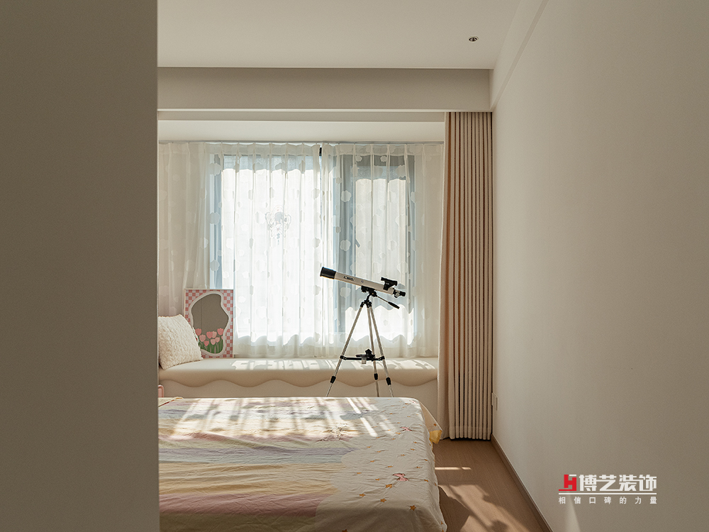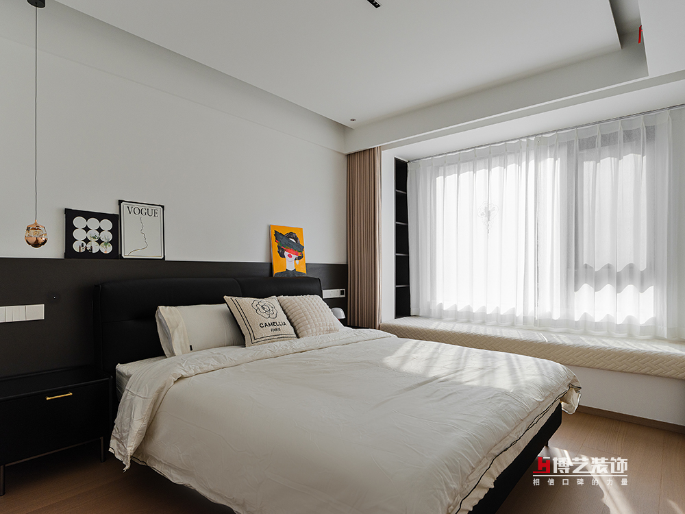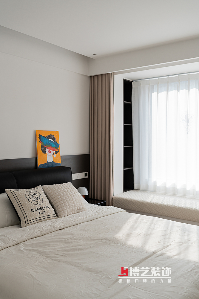 臥室的飄窗區(qū)域被巧妙地利用起來,窗臺(tái)上鋪設(shè)著柔軟的軟包,搭配壁龕式的書架,便成了一個(gè)舒適的休閑角落。在這里,可以慵懶地倚靠在窗邊,透過飄窗欣賞著室外的美景,感受著陽光灑在身上的溫暖,讓身心在這一刻徹底放松。