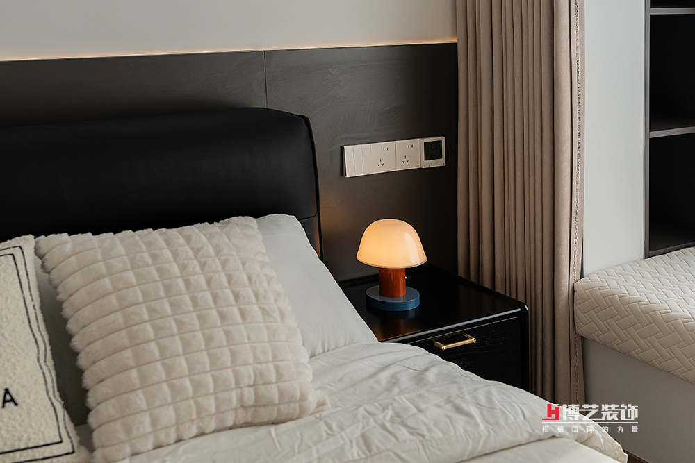 床頭背景墻采用黑色木作材質(zhì),搭配上深邃的黑色真皮大床,更添一份沉穩(wěn)與質(zhì)感。床頭一側(cè)則擺放著一盞蘑菇臺(tái)燈,其造型簡(jiǎn)約而別致,圓潤(rùn)的燈罩宛如一朵綻放的蘑菇,散發(fā)出柔和而溫暖的光線,為夜晚的閱讀或小憩時(shí)光增添了一份浪漫與愜意。