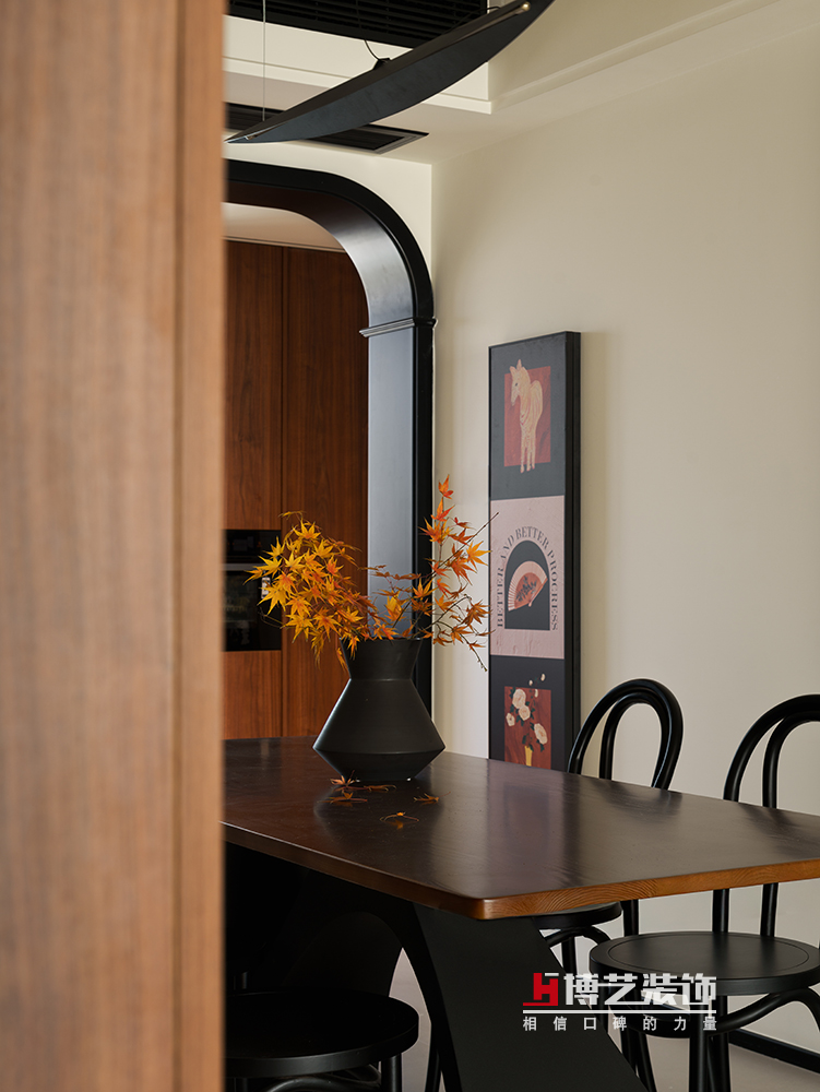 整個餐廳空間以暖白色為基調(diào),溫暖的胡桃木勾勒出溫馨的就餐氛圍,摩登和復(fù)古在此碰撞出時(shí)髦的火花。幾枝紅楓仿佛在不經(jīng)意間就完成了自然與人文的對話。