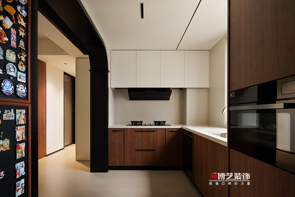 選用胡桃木溫暖的材質(zhì),與白色的臺面呼應(yīng),復(fù)古中不乏帶點(diǎn)清爽,呈現(xiàn)不一樣的生活氣息??瞻椎囊幻鎵α艚o家里的收藏——冰箱貼,時(shí)間在這里變得柔軟,過去的歡樂時(shí)光仿佛電影般在這里呈現(xiàn)。