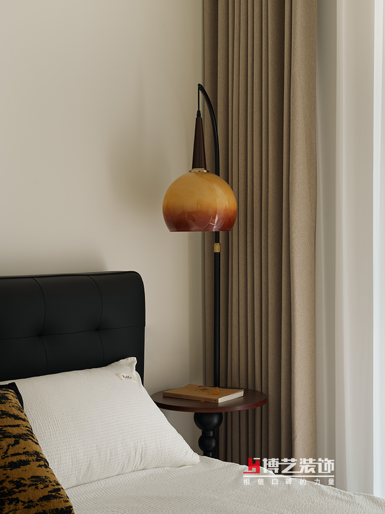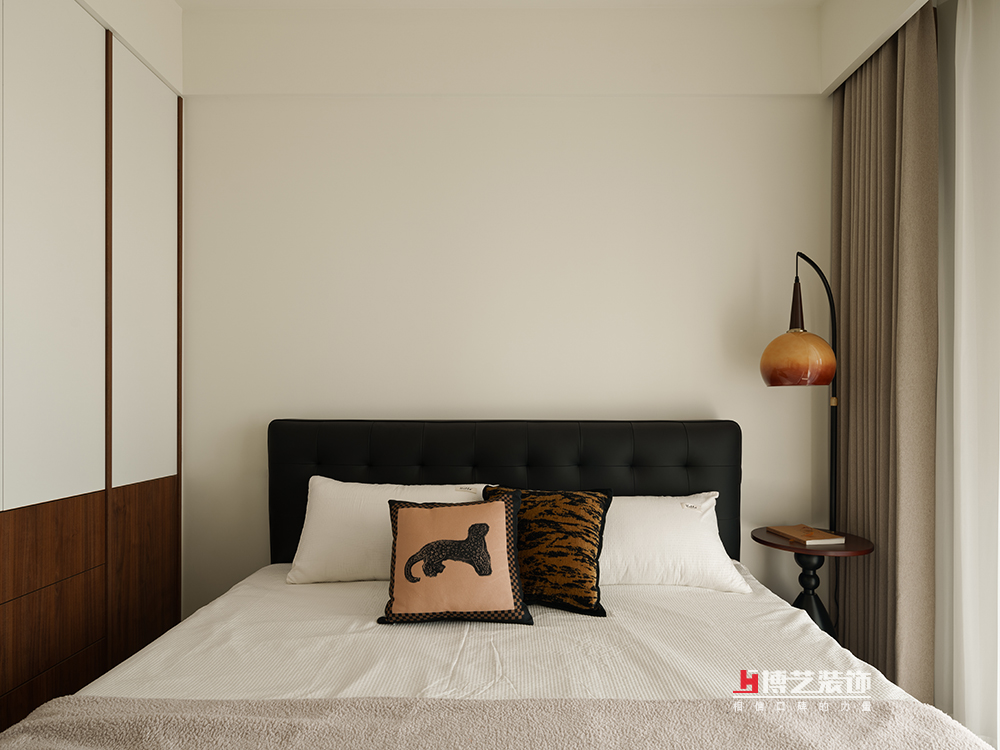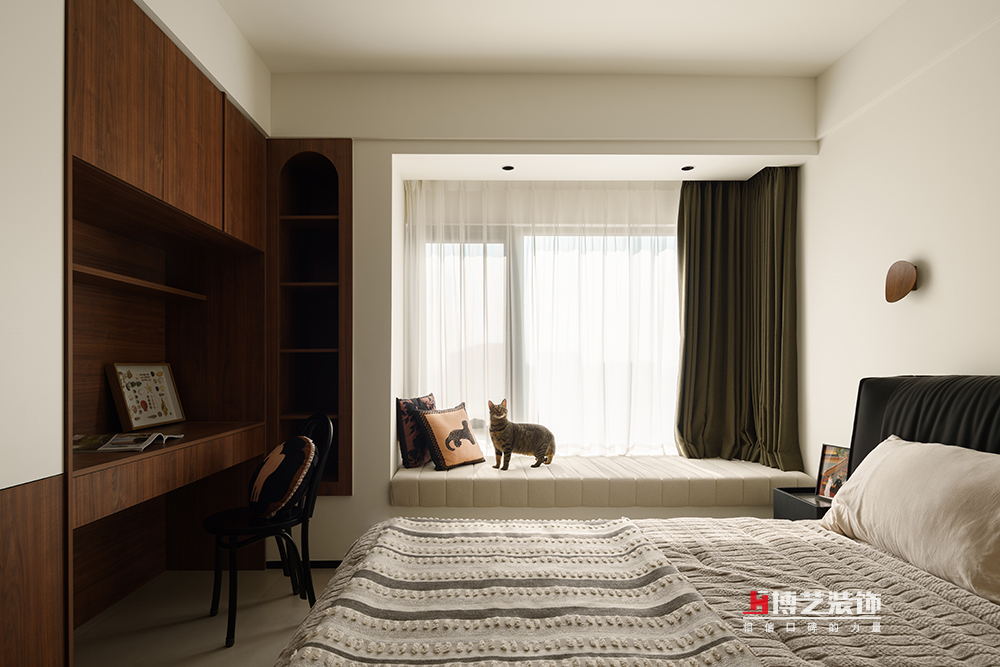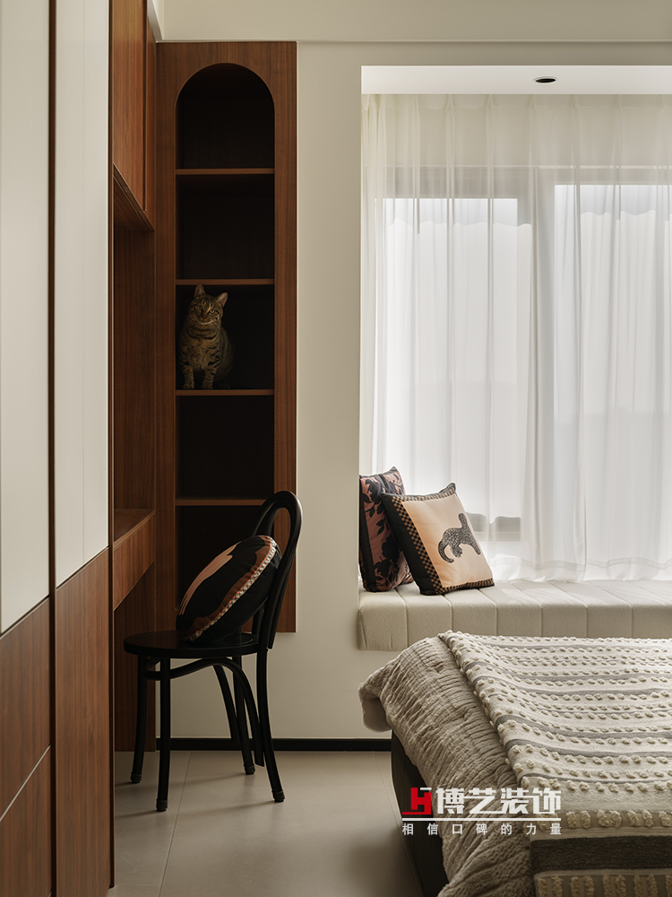 相對整個公區(qū)的絕對開放,這里則是主人另一方私密領(lǐng)域。保留了飄窗,墊上了墊子就成了主臥里的一個休閑空間。床頭衣柜的位置為女主人保留了梳妝臺,同時(shí)也可做簡單的工作學(xué)習(xí),讓一個空間承載了多種功能。復(fù)古中帶著簡約,光通過紗緩緩地照進(jìn)屋子,讓個空間呈現(xiàn)了別樣的溫暖。