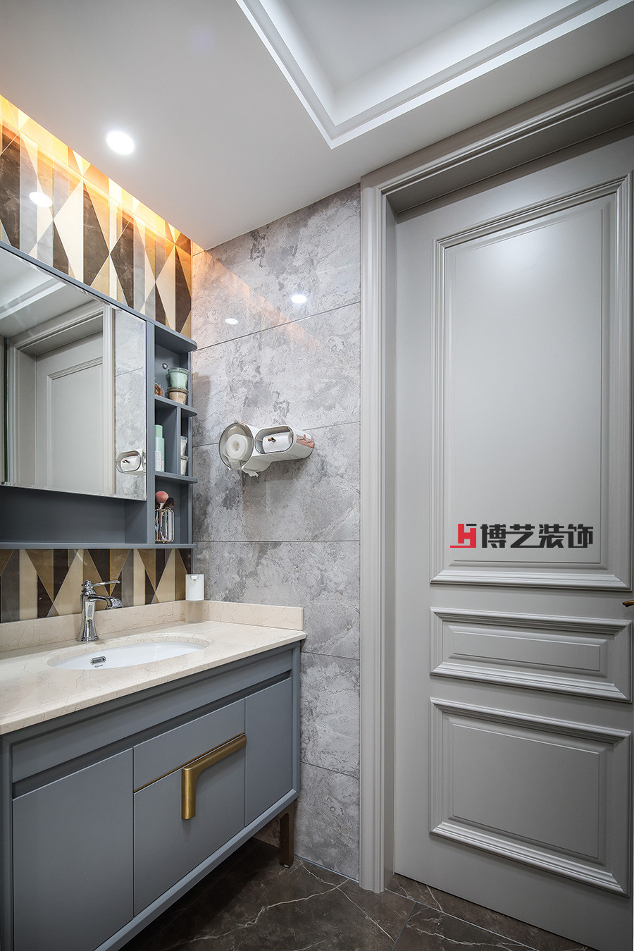 衛(wèi)生間做干濕分離,墻面鋪貼幾何形圖文墻磚,搭配莫蘭迪灰藍(lán)色櫥柜門,挑亮空間的同時(shí),又豐富了空間層次。