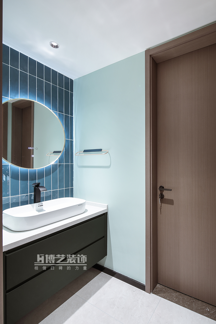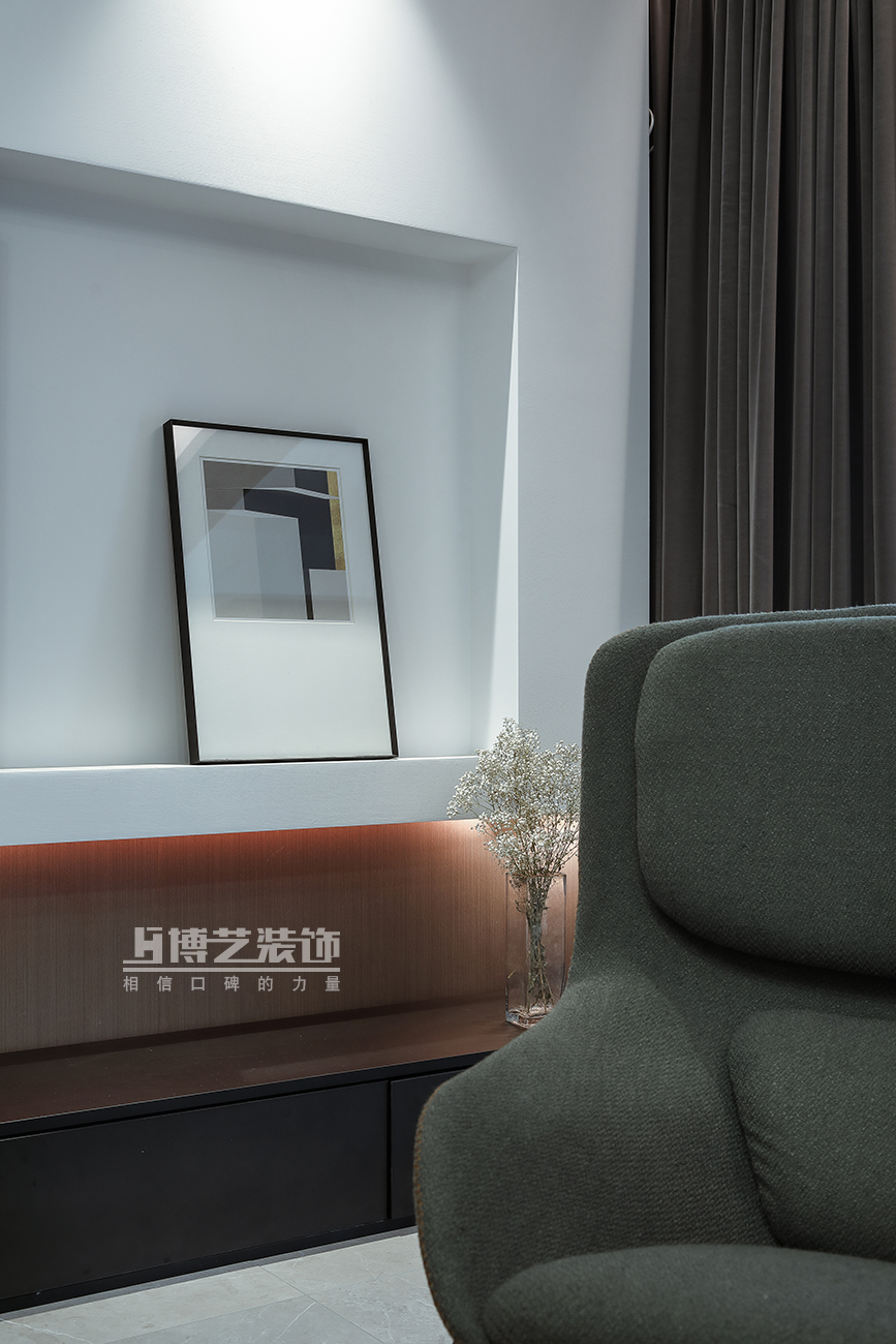 客廳受原始結(jié)構(gòu)的限制,設(shè)計師把落座的沙發(fā)放置在較寬裕的一面提升舒適感,次臥的門采用隱形門的設(shè)計,很大程度上擴大了原本電視背景墻的寬度,色彩上以白色做中色,調(diào)和莫蘭迪藍色與棕色的碰撞,豐富空間層次感。