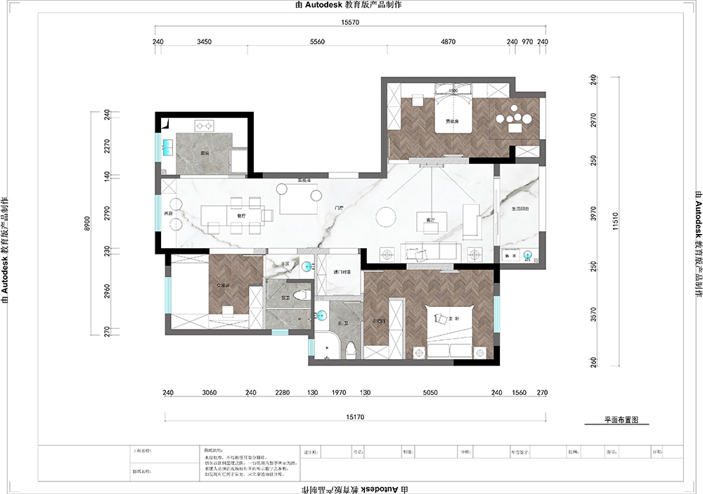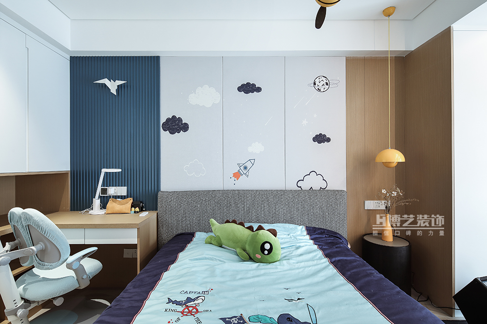 由于男孩在學(xué)習(xí)架子鼓,所以設(shè)計師把小陽臺打作為練習(xí)區(qū),用藍色、棕色、灰色三中顏色,不同材質(zhì)的造型背景表達男孩活潑好動的性格。