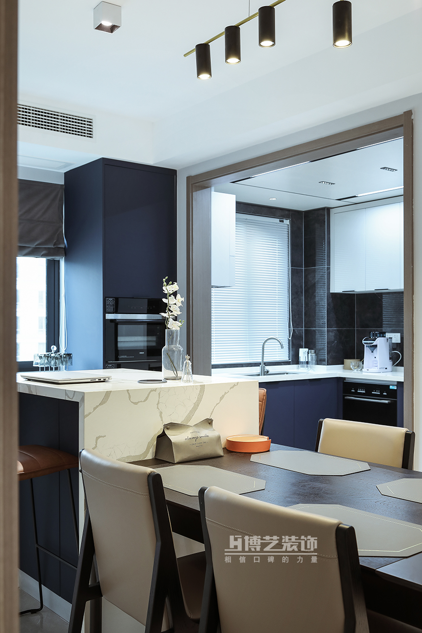 原始的公共區(qū)域使得餐廳的位置顯得有些狹長,設(shè)計師利用長度優(yōu)勢,加入西廚的功能,同時島臺與廚房也可以形成功能上的連接,讓家人間的互動更和諧。