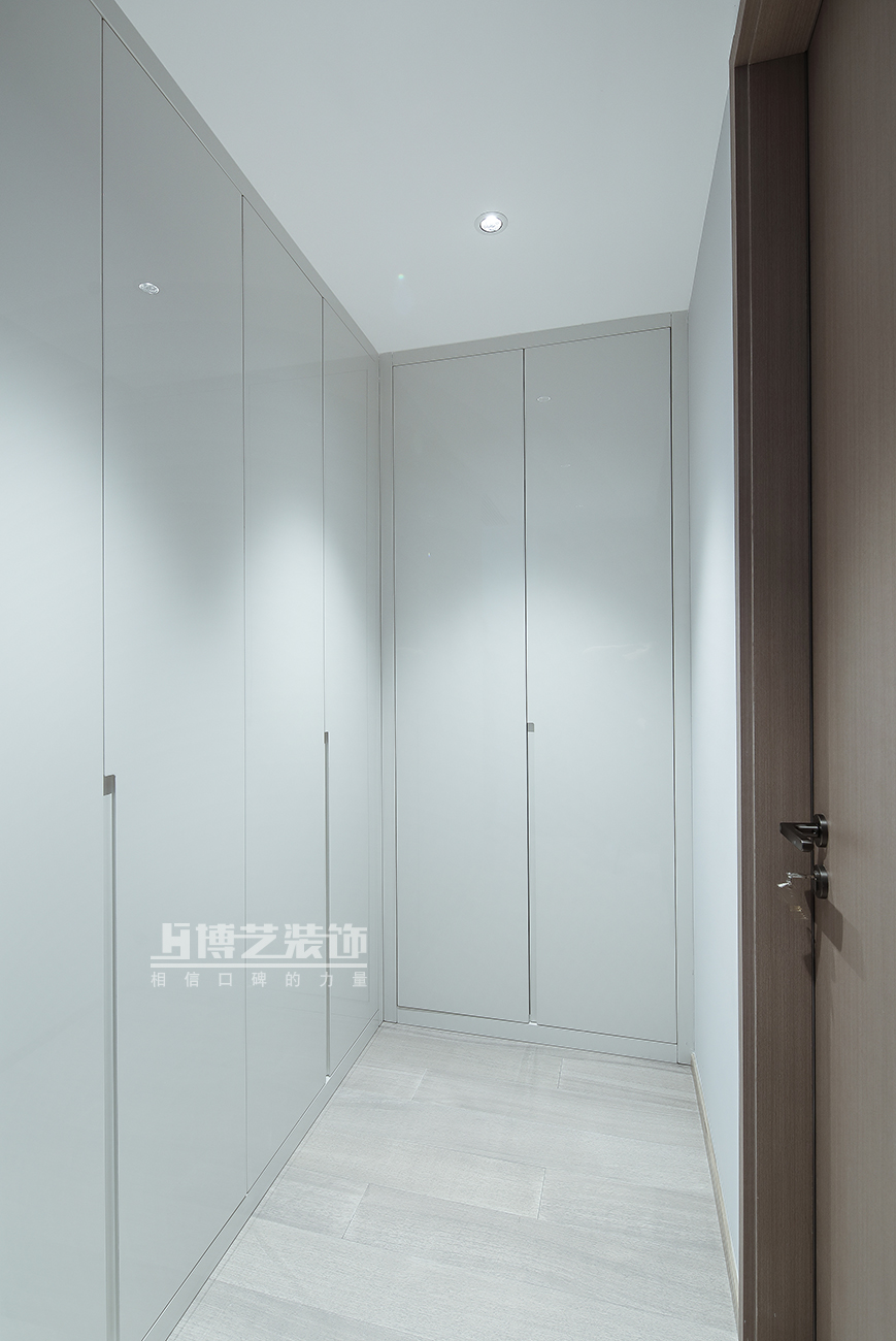 利用主臥門口的公共區(qū)域設(shè)計入門對景,增加收納同時增加主臥的私密性;主臥墻面用簡單的涂料提升視覺感官,兩邊的燈光提供臥室溫馨的氛圍。