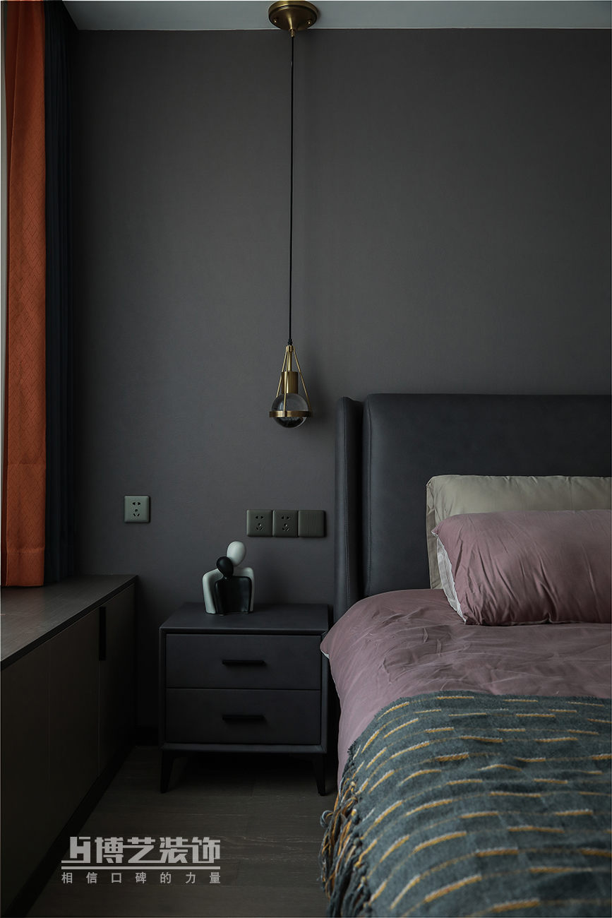 主臥的空間沒有復(fù)雜的裝飾,也不沒有濃艷的色彩,以一面低調(diào)雅致的暗色系墻面,營造安眠的氛圍,床頭下落的燈飾,在黑夜中點(diǎn)亮溫度,讓情感溫柔的盤旋。