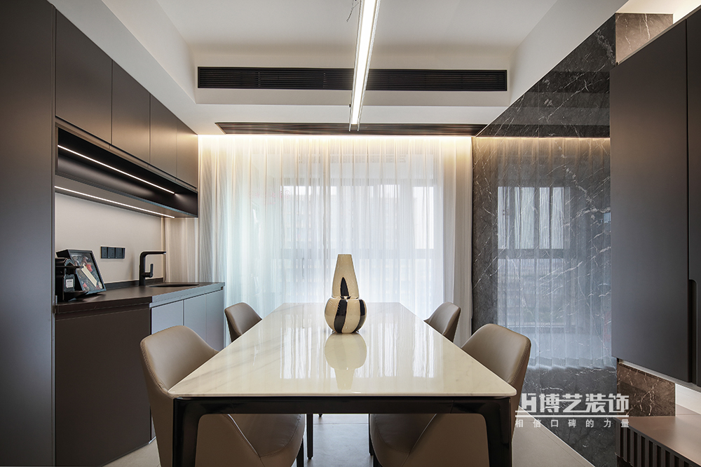 我們把餐廳的位置移到朝南采光更好的空間,臨著陽臺,觀四季變幻,品人間煙火??窟呑霾瓦吂裨黾邮占{功能,水吧的設(shè)置更是開拓了餐廳其他功能。