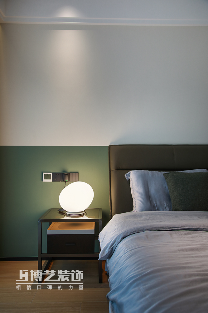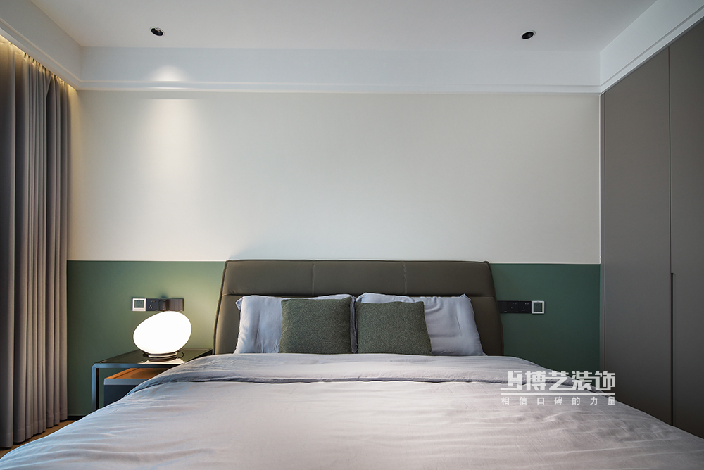 主臥保持整體極簡的風(fēng)格,簡單的白色與墨綠沖撞,營造迷人的視覺沖突。