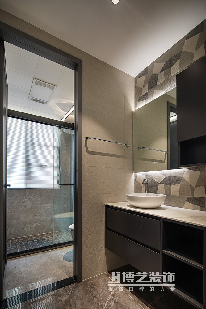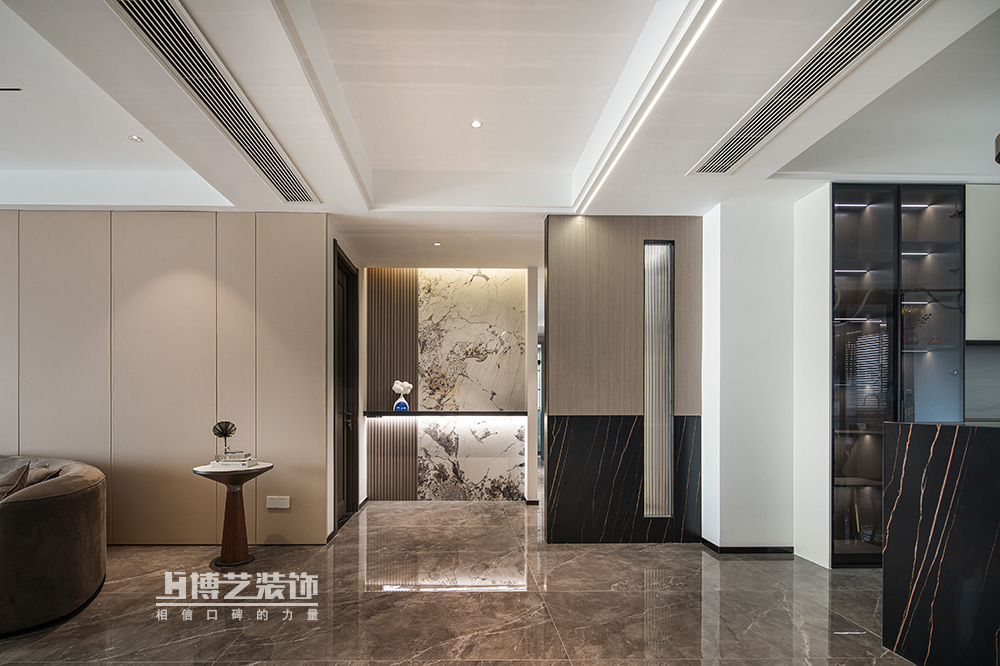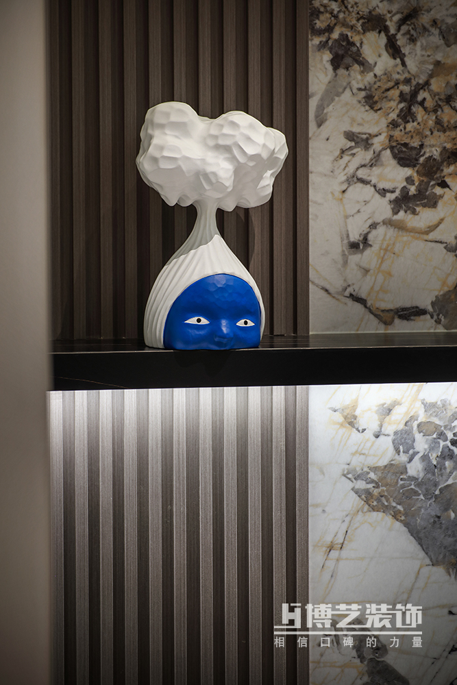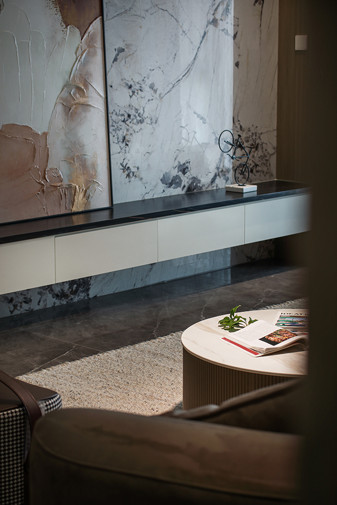 一進(jìn)門,映入眼簾的是轉(zhuǎn)角設(shè)計和隔斷,平行的對角錯落形成視覺上的“進(jìn)”與“退”,太妃糖色與白色大理石照應(yīng)出幾分俏皮與溫柔,與黑色襯托出沉穩(wěn)靜謐,疲憊的身體仿佛一下被拉回。