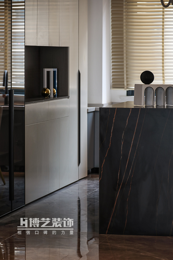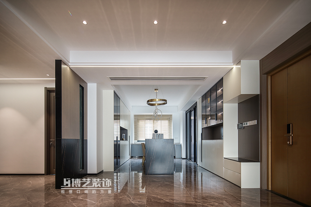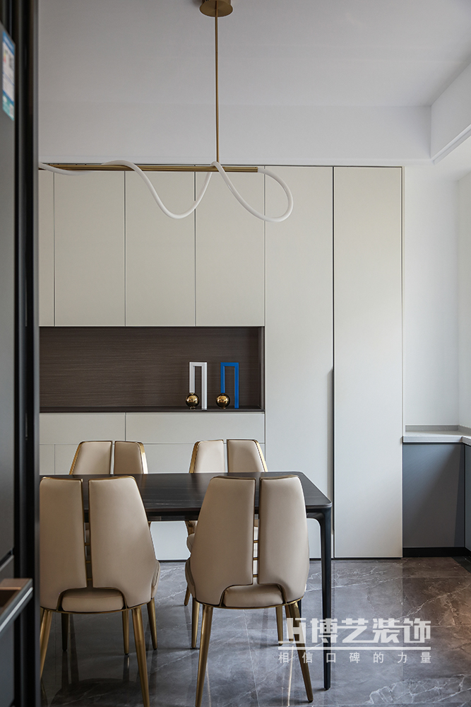 餐廳做“回”字型結(jié)構(gòu),寬敞的空間滿足六口人進(jìn)餐而不被擁擠。兩邊的餐邊柜增加了更多的收納功能,靠近門口的一側(cè)做換鞋凳,方便生活起居。