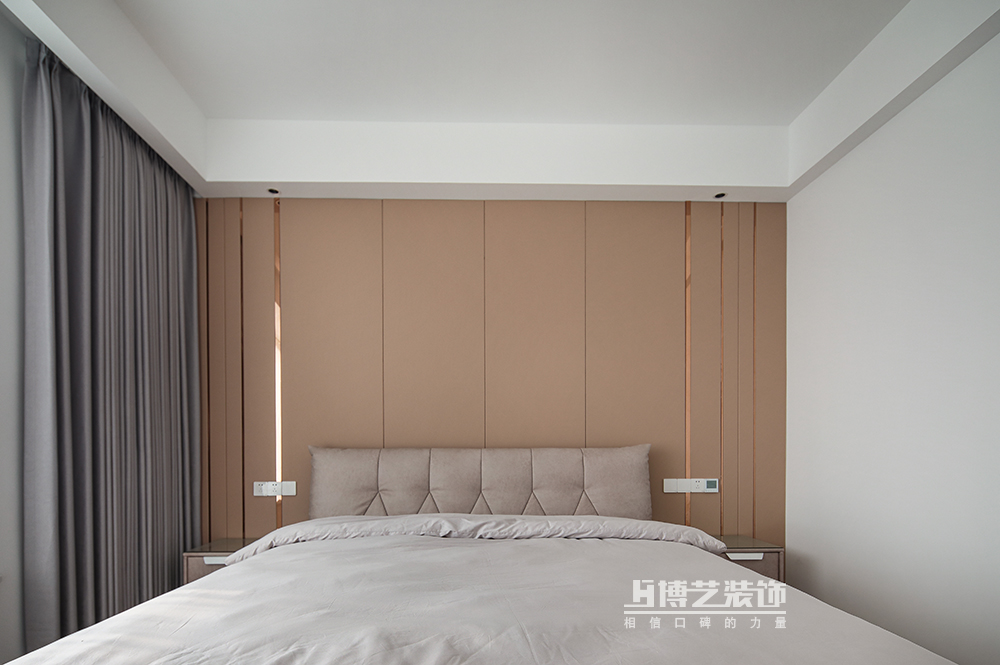 奶咖色的床背景嵌入不規(guī)則金屬點綴,典雅而高貴,搭配絲絨的床頭低調(diào)又高級,這點點輕奢的格調(diào)化作兩個人的浪漫,夢境里都是甜甜的。