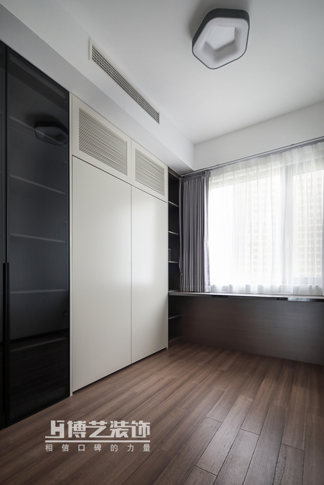 北次臥靠墻打書柜,添置一張墨菲床收起來美觀且解放空間,暫時可做學(xué)習(xí)室或瑜伽室,未來可作為另一間兒童房。
